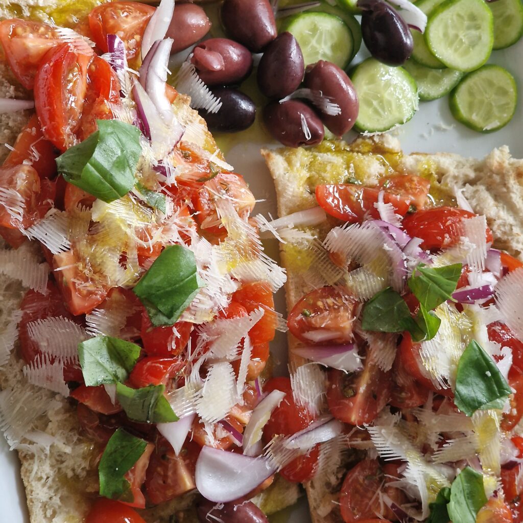 TIPP: Man kann die Bruschetta noch mit z.B. Gurken, Weichkäse, wie Feta, Oliven und Kräutern garnieren, ganz so, wie man möchte.